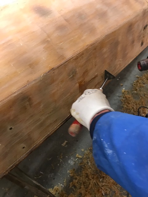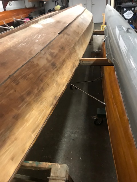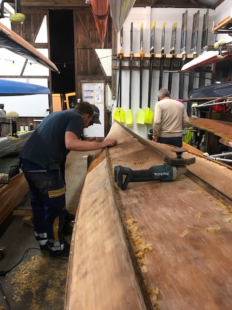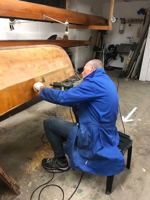 Clublid Jacob was in zijn eentje met krabben en schuren begonnen. Gelukkig kreeg hij een week later al hulp, zo stonden er regelmatig drie lakbranders en schuurmachines te zwoegen in de handen van Jacob, Rob en Annemarie. Slechte plekken werden door Daan gevuld met goede 2-componenten vuller, met toegevoegd pigment van verfmolen De Kat om de kleur zo goed mogelijk te laten overeenkomen met het hout. Ook historische aanvaarschade is door de vaardige handen van Daan gerepareerd. Avonden schuren volgenden nog, waarna het geleidelijk opbouwen van de lak weer kon beginnen.